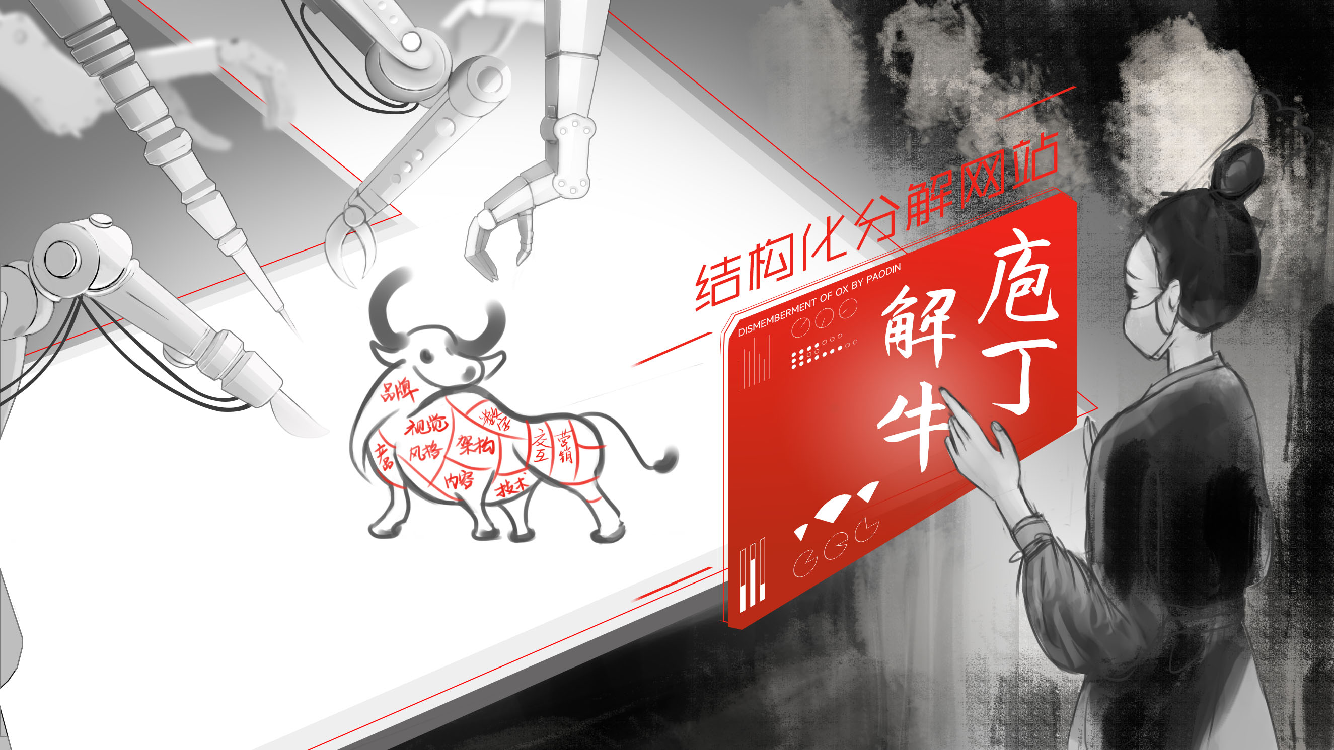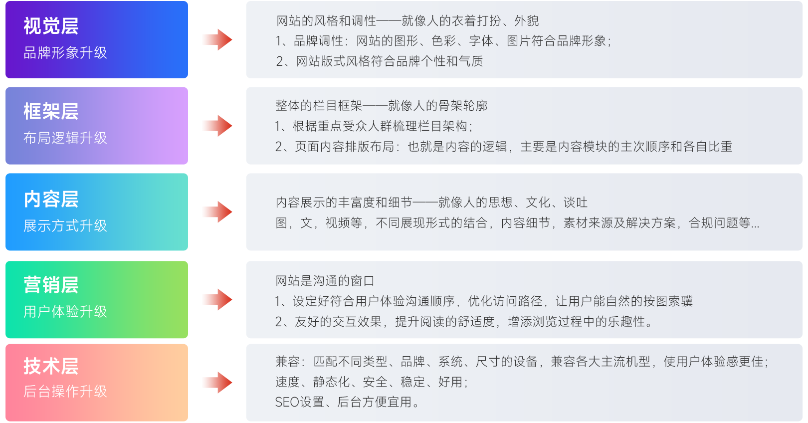 在官網(wǎng)建設(shè)中,全局化的思維是非常重要的。需要先全局再局部,結(jié)構(gòu)化來看官網(wǎng)。如何結(jié)構(gòu)化呢,我們可以借鑒“庖丁解牛”的方法,把官網(wǎng)分成五大維度模型:視覺層 架構(gòu)層 內(nèi)容層 營銷層 技術(shù)層。